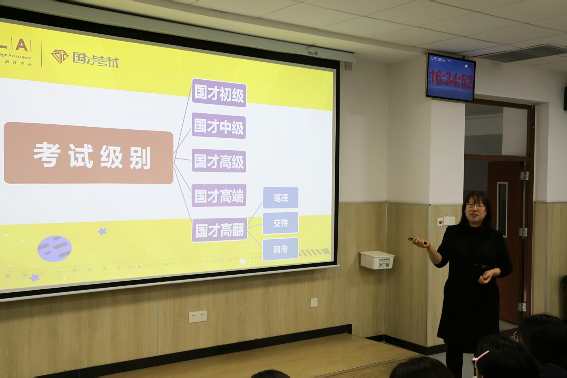 10月16日,yl6776永利集团在平度校区博学楼A301举办“语言筑梦,国才领航”国才考试宣讲会,会议由英语系副主任左燕茹主讲,yl6776永利集团2025级英语专业全体学生参加。