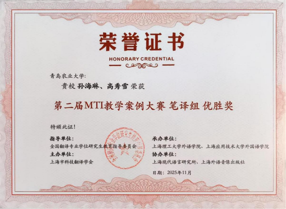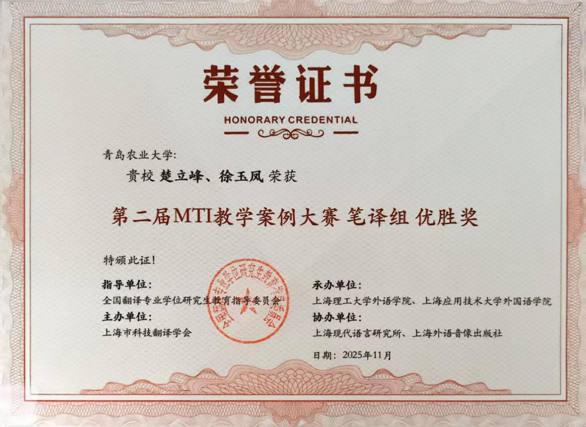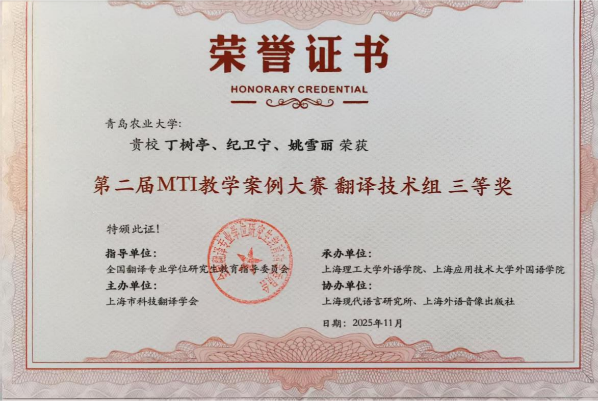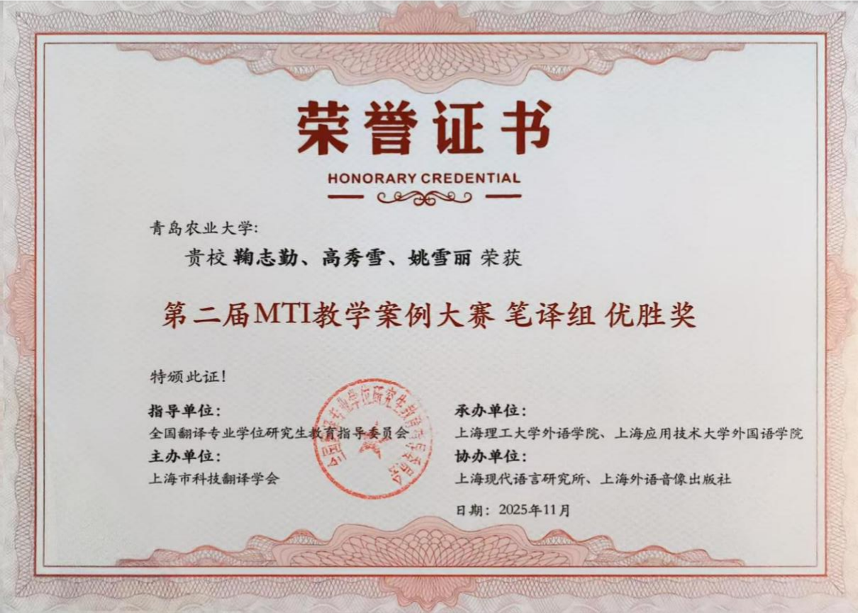 大赛共设笔译、口译、翻译技术、翻译项目管理四个组别,吸引了来自全国122所院校的227份教学案例参赛。经过多轮专家评审,最终评选出一、二、三等奖及优胜奖。我院教师王珍团队的《中国农业特色文化翻译实践中的理解与表达》获笔译组三等奖,丁树亭团队的《筑基农学术语标准,擎画战略兴农新程》获翻译技术组三等奖。鞠志勤团队的《农业科技英语名词化结构的翻译与译后编辑》、孙海琳团队的《天下兴亡,译夫有责一一我国翻译史上的原本选择》以及楚立峰团队的《笔译理论与技巧》获笔译组优胜奖。此次比赛我校积极组织多支参赛队伍,且表现优异,主办方特颁发优秀组织奖。